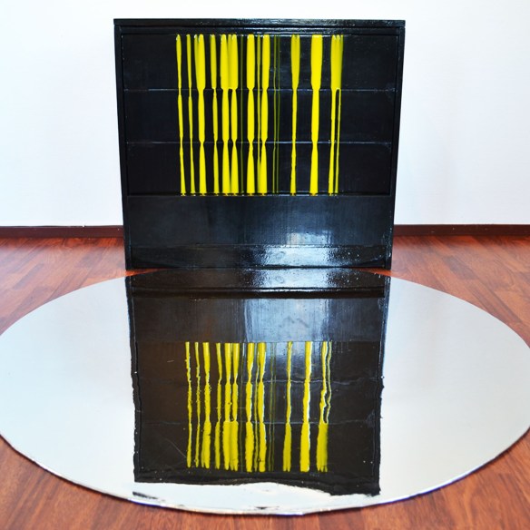 Code Yellow 2014 The Yellow oil comes out from the top drawer and pours down to the bottom drawer getting pumped back up again in a closed cycle. wood, epoxy, enamel paint, olive oil, yellow pigment, fountain pump, mirror foil 60x80x40 cm.
