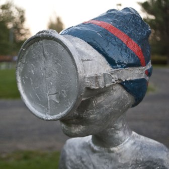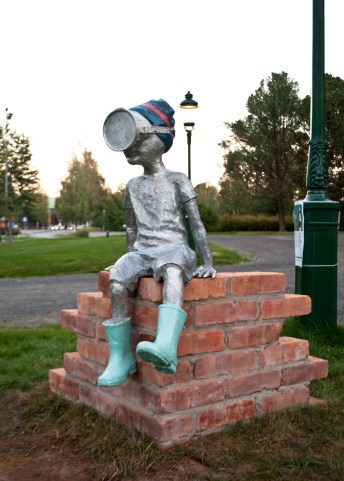 Umeå City Church Hoppare Sculpture in aluminium and bricks placed outside Umeå city church 120 cm x 80 x 80 cm.