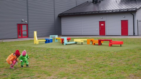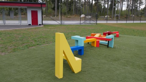A playsculpture in painted stainless steel outside the Sporting Arena in Tierp.The sculpture is a play with the word VEGAVALLEN in the form of rebuilt letters.